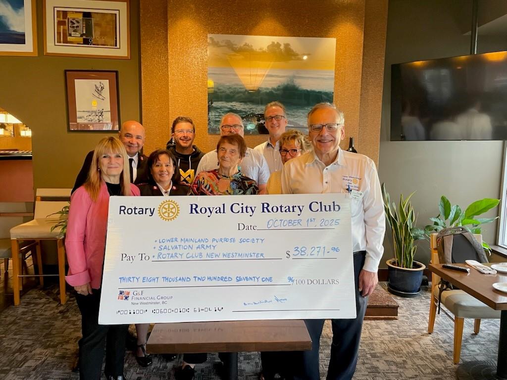 The funds raised from this year’s Pot of Gold Golf Tournament were presented to the Salvation Army, the Lower Mainland Purpose Society High School, and the New Westminster Rotary Club at our weekly 7:00AM Wednesday breakfast meeting held at the Boathouse Restaurant, New Westminster. This marks another highly successful year for the tournament, which has now generated more than $750,000 in support of local charities.
